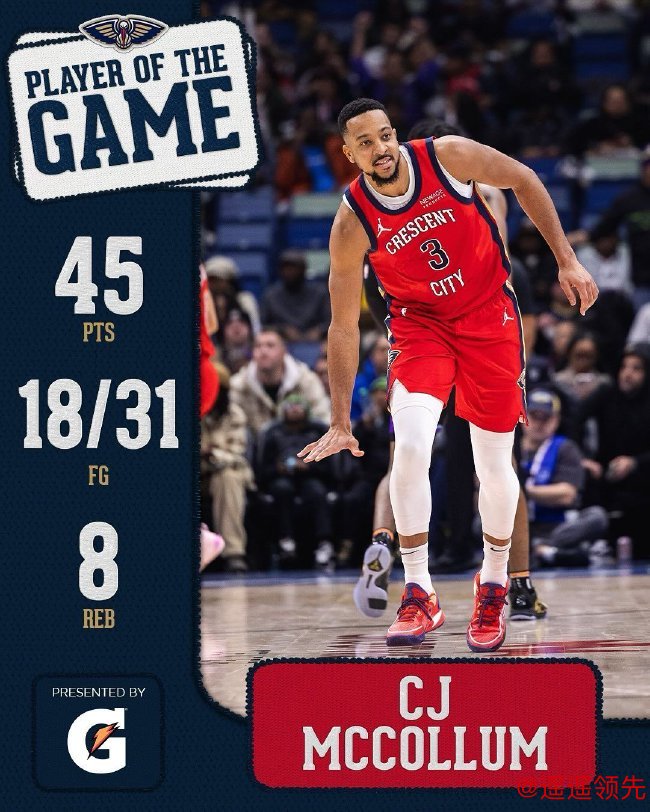 鹈鹕首节便落后近20分,最多时落后达到25分。凭借着下半场的出色发挥,鹈鹕将比赛拖入加时,并在加时赛发挥出色赢下比赛。麦科勒姆31投18中轰下45分8篮板4助攻率队取胜,鹈鹕取得4连胜。